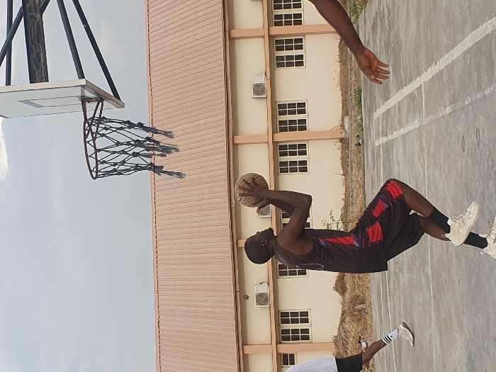 On an outdoor basketball court, a player in black shorts and jersey prepares to shoot