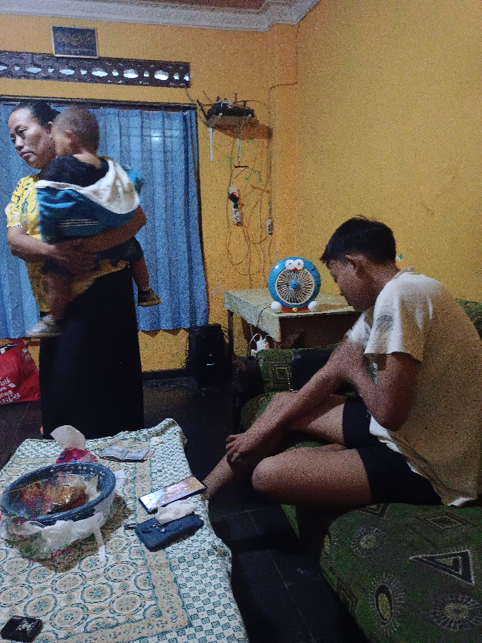 This image depicts an indoor scene in a residential dwelling in Kecamatan Pati, Indonesia, featuring three individuals and various household objects