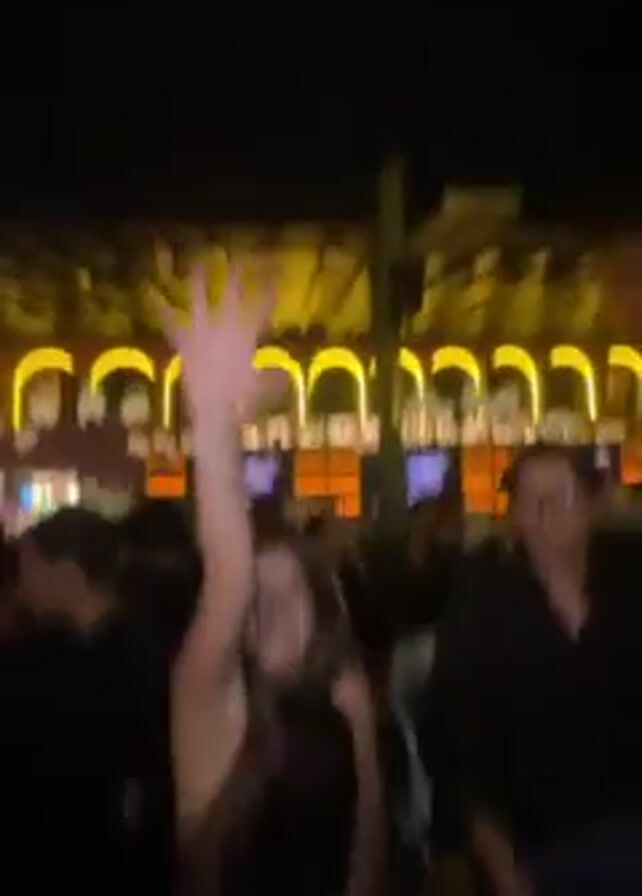 The video takes place at night, likely at an outdoor party or club. The area is lit by bright, yellowish-orange lighting fixtures forming an archway. A woman in a dark halter top and pants is in the center of the frame. She is holding a drink and gesturing towards the camera. Several other people are visible in the background, most dressed in dark clothing. Some are standing and talking, while others are simply present in the crowded scene. The focus remains on the woman in the center as she playfully interacts with the camera.