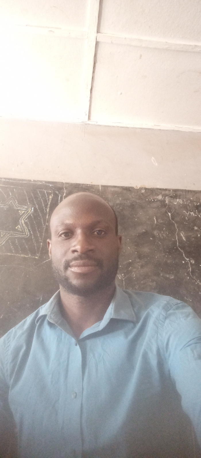 This image depicts an adult male indoors in Barnawa, Nigeria. The subject is a dark-skinned male with a shaved head and a short, dark beard, gazing directly at the viewer with a neutral facial expression. He is wearing a light blue, collared, long-sleeved button-down shirt, which appears slightly creased. The background features a dark, vertically oriented surface, consistent with a chalkboard, upon which faint, light-colored chalk markings are visible, including a multi-pointed star design on the left side. Above this dark surface, a lighter, off-white wall segment is present. The upper portion of the image shows a white ceiling with discernible structural beams or panels. The scene is uniformly lit. No actions or interactions beyond the subject posing for the photograph are evident.