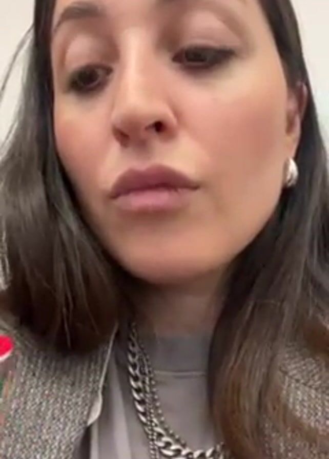 A medium close-up shot shows a woman applying lipstick. She is fair-skinned with brown eyes and dark brown hair. She wears a grey shirt, a grey plaid jacket, silver hoop earrings, and multiple silver chains. She also wears two silver rings on her left hand, one with a green stone. She holds a tube of red lipstick and applies it to her bottom lip. The background is a plain, light-colored wall.