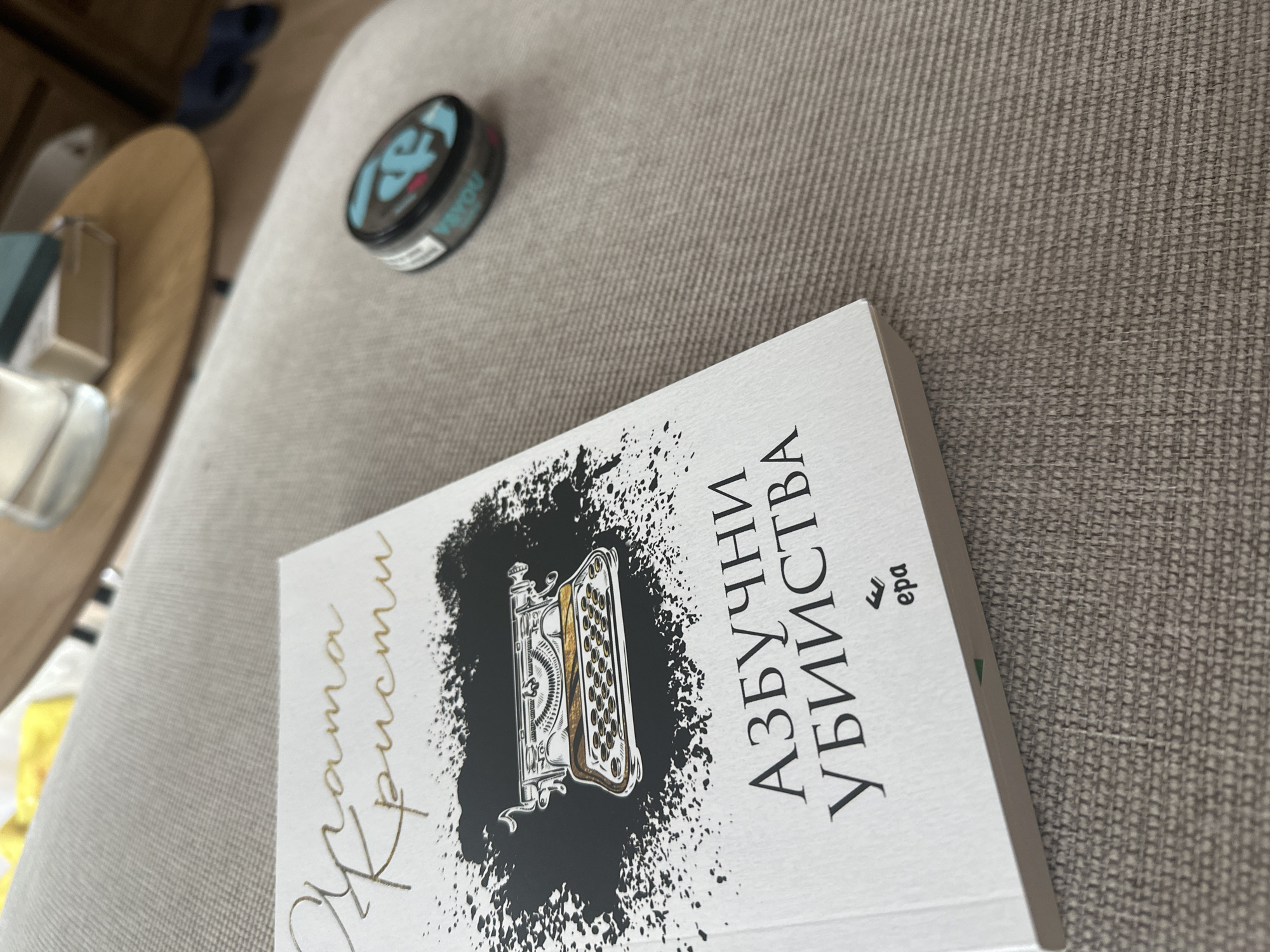 The scene shows a close-up shot of a book titled "Azbuchni Ubiistva" by Agatha Christie, translated into Bulgarian. The book rests on a light brown textured surface, possibly a sofa or chair. A black tin with a blue and white label is visible in the upper left corner of the frame. A small wooden side table and a pair of blue shoes are also visible in the background. It is not possible to determine the location in Sofia, Bulgaria, from the given image.