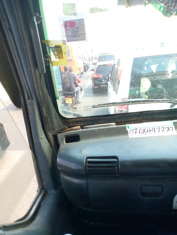 The image provides an interior view from a vehicle, looking out through the front passenger-side window onto an urban street with heavy traffic congestion. The foreground exhibits the vehicle's dark dashboard with an air vent and a white strip of paper displaying the handwritten number "0758497779" below the windshield. Various stickers, including one yellow sticker with "COVID" and another with "Detlers," are affixed to the upper windshield. The exterior scene features multiple vehicles on a multi-lane asphalt road, appearing stationary or moving slowly in a traffic jam. A dark-colored motorcycle, bearing the license plate "KMIO 747E", occupies the center-left. Two male individuals are riding the motorcycle; the driver wears a dark cap and shirt, while the passenger, seated behind, carries a grey backpack and wears light-colored trousers. Ahead of the motorcycle, a black SUV is visible, followed by a line of other cars. To the immediate right, adjacent to the camera vehicle, is the rear of a white van or SUV. An orange bus is discernible further down the road on the left. The scene is illuminated by bright daylight. The location is an unspecified city, Unknown, Unknown.