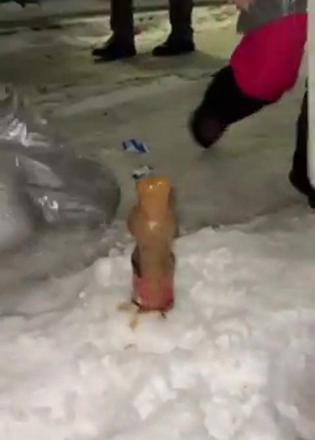 two children conducting a science experiment in the snow. One child, kneeling and wearing a silver puffer jacket, drops small white candies (likely Mentos) into a small brown bottle of soda, causing it to erupt. The second child, also wearing a silver puffer jacket and red pants, is kneeling nearby. The explosion sends soda and candy pieces flying. The ground is covered in snow. The action happens outdoors, possibly in a residential area.