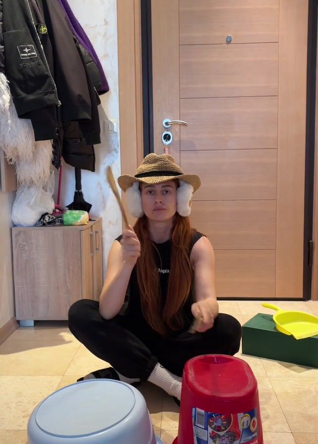 A woman wearing a straw hat and earmuffs sits cross-legged on the floor in an entryway, striking a blue bucket and a red bucket with wooden spoons as though they are drums. Her hair is auburn. She is wearing a black sleeveless shirt and black pants. There is a dustpan on a green box nearby, and coats hang on a rack beside a small cabinet. A light-colored door is visible in the background. The walls are light-colored. A yellow sticky note is on the door.