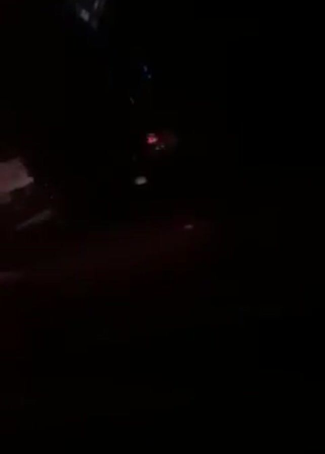night-time view from inside a car, looking out the windshield at other vehicles in a traffic jam. The brake lights of the cars ahead are illuminated, and the environment is dark. The focus is on the vehicle directly in front, a white Mercedes-Benz C230, with its license plate visible. The footage is shaky.