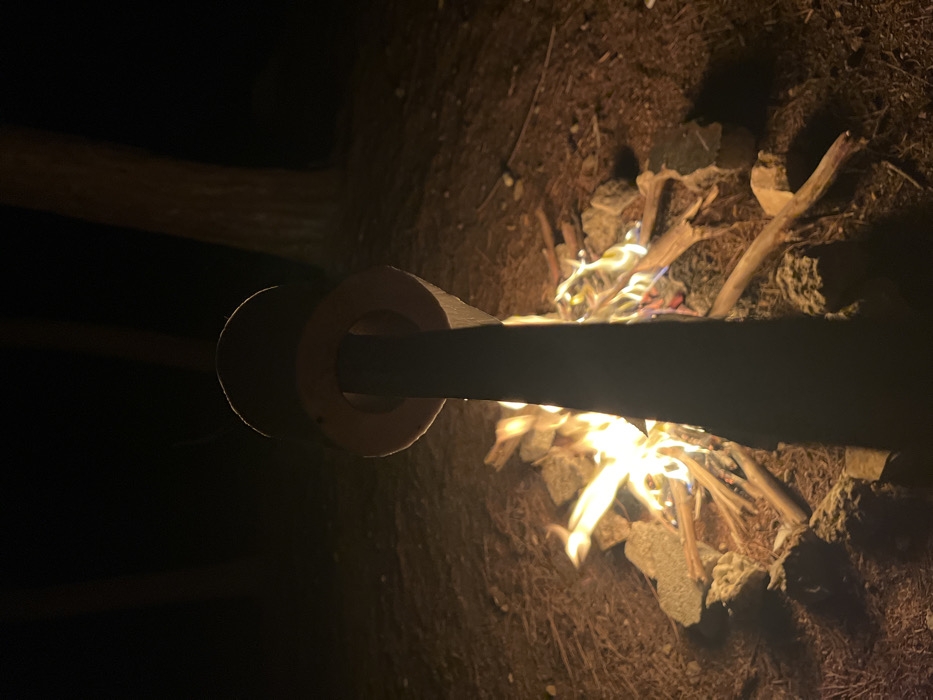 The image depicts an outdoor scene at night, situated in a wooded area or forest within the city of Modi'in-Maccabim-Re'ut, Israel. A ground-level campfire is actively burning in the lower portion of the frame, consisting of various wood pieces emitting bright orange, yellow, and red flames with some blue at the base. The fire is contained by a rudimentary circular arrangement of irregularly shaped rocks. The surrounding ground is dark earth covered with natural debris, likely forest litter. In the background, multiple tree trunks are dimly visible against the deep darkness. A dark, vertical, elongated object, consistent with a pole or stick, occupies the central foreground, extending from the bottom edge and partially obscuring the fire. Two light-colored, annular objects, consistent with marshmallows, are affixed to this vertical object, positioned directly over the active flames. No individuals are present in the visible frame.