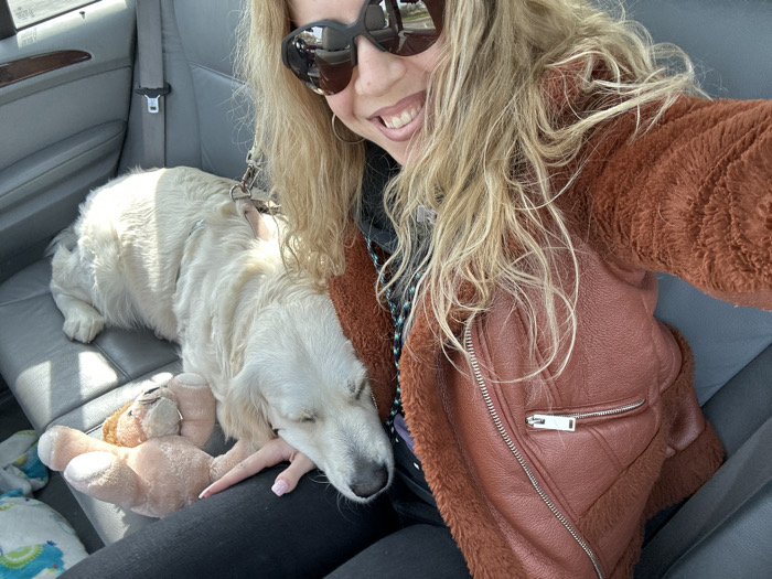 An image taken from a first-person perspective depicts a woman and a dog inside the rear passenger compartment of a vehicle