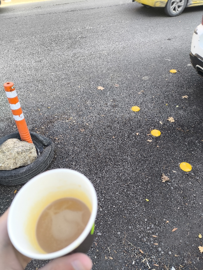 A first-person perspective image captures a scene on an asphalt surface within Sarouja Municipality, Syria. In the immediate foreground, a hand holds a white disposable cup containing a light brown liquid. To the left, an orange and white striped traffic delineator post is positioned within a worn black tire, which also contains a large, light-colored rock providing ballast. The dark asphalt ground is visibly wet in areas and scattered with dry brown leaves. Several bright yellow, circular road markers are distributed across the asphalt, roughly aligning in a path from mid-ground to the upper right. In the upper right background, the rear section of a white vehicle is partially visible, parked on the asphalt. Further to the left in the background, a portion of a yellow vehicle, including a front wheel, is also visible on the asphalt.