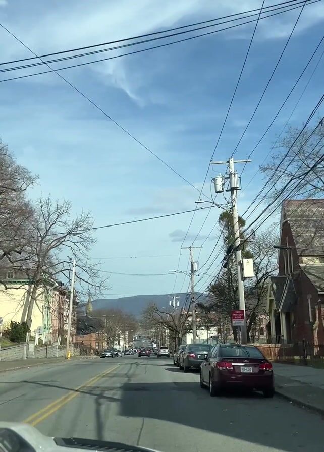 car driving down a street in a residential neighborhood. The street is lined with buildings, some of which are brick, and bare trees. Power lines crisscross above the street. In the distance, mountains are visible under a blue sky with white clouds. Several cars are parked along the side of the road, and a few cars are driving in the opposite direction. A church steeple can be seen in the distance. The perspective is from inside the car, looking out through the windshield. Latin music is playing.