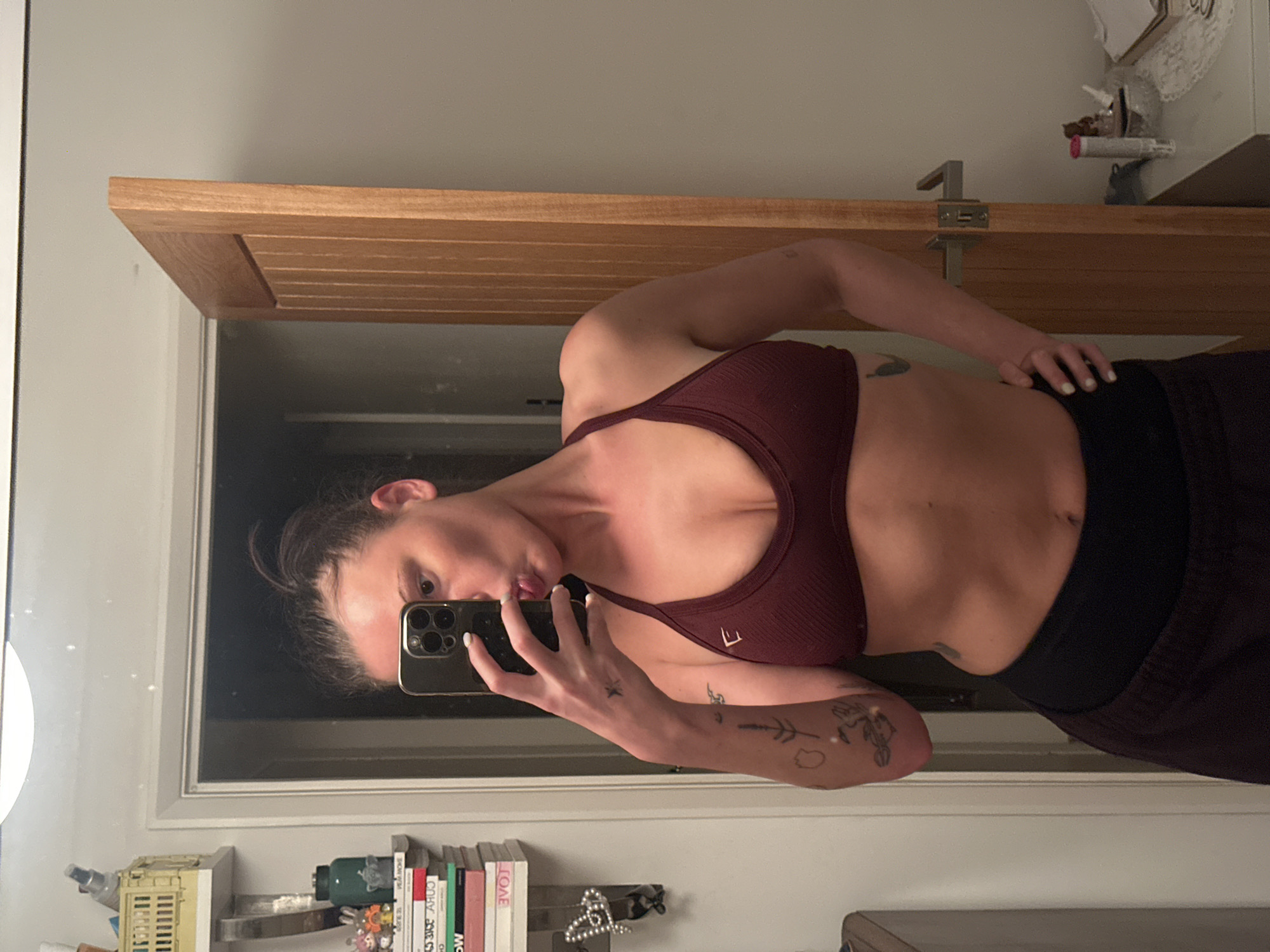 woman taking a selfie in what appears to be a bathroom. She is wearing a maroon sports bra and dark pants. Her hair is pulled back. The reflection shows various items on a shelf including books and containers. The location appears to be indoors, likely in a home, but there are no indicators tying this to Wealden, UK specifically.