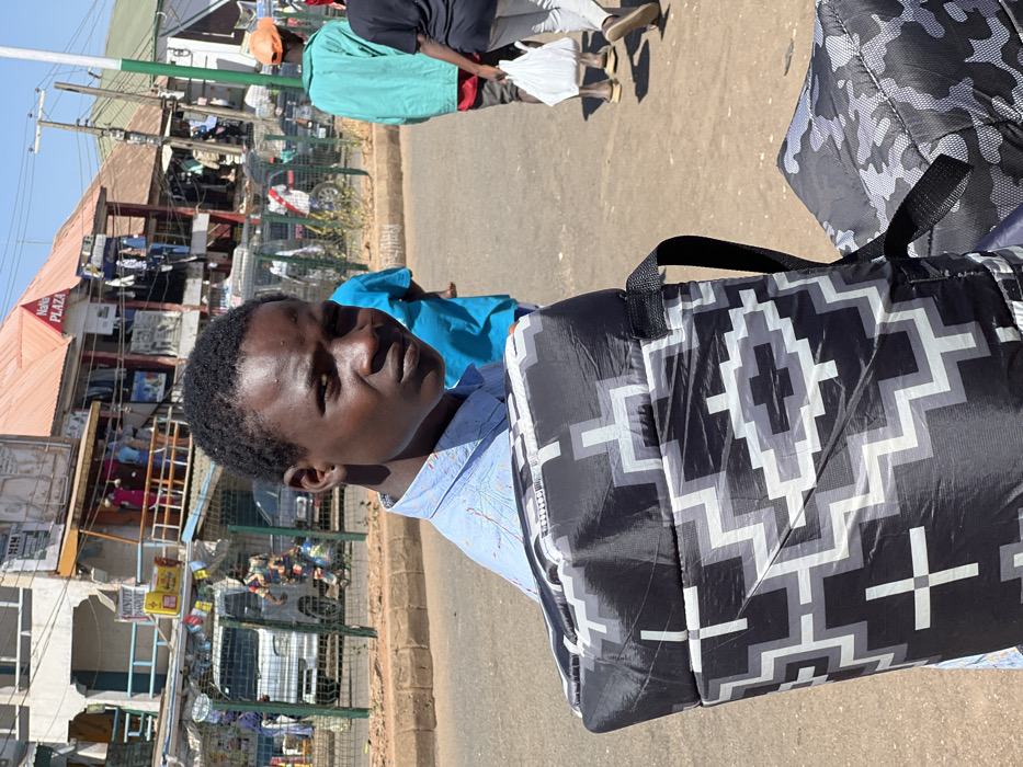 A young Black male, approximately 18-25 years old, occupies the foreground, looking directly at the camera with a neutral expression. He has short, dark, kinky hair and wears a light blue, patterned button-up shirt. He is carrying two large, rectangular bags; the primary bag in the immediate foreground features a black, grey, and white geometric pattern composed of interlocking chevrons and cross shapes. A secondary, smaller bag with a grey and black camouflage pattern is visible to his right. The scene depicts an urban street environment within Bukuru, Nigeria. The ground consists of reddish-brown soil and a paved road, separated by a low, brown curb. A green metal mesh fence runs parallel to the road. In the mid-ground, multiple individuals are visible: one partially obscured person in a turquoise shirt behind the main subject, and further back, a person wearing a teal jacket and an orange baseball cap walks away, carrying a white plastic bag. Another person in a dark shirt and light pants follows, also carrying a white plastic bag. The background features multi-story commercial buildings under a clear blue sky. One prominent building has a red corrugated metal roof and a visible sign marked "NANA PLAZA" in red letters. Numerous garments are displayed on the balconies and railings of these buildings, indicative of retail operations. Another building displays signs, including "MIM" and "MINUTE MARKET." Vehicles, including a white van, are present on the street beyond the fence. The scene is brightly illuminated by natural daylight.
