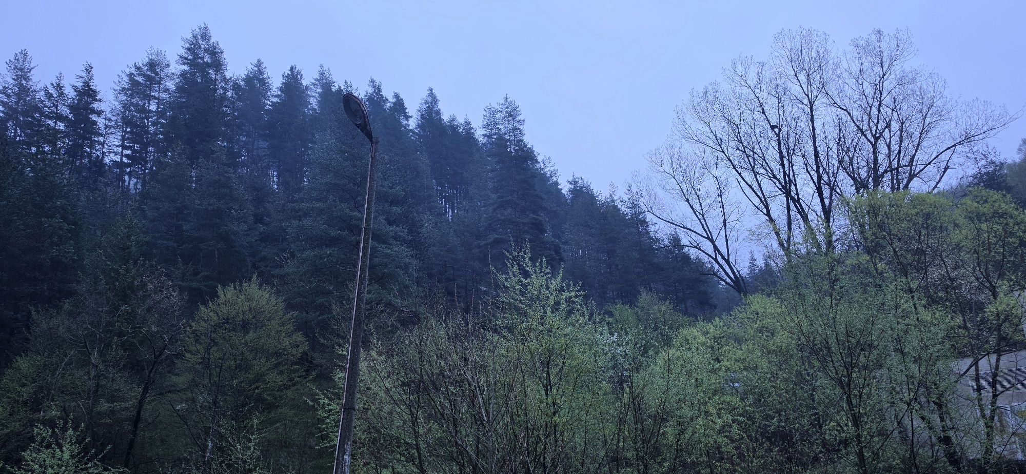 forest scene in Smolyan, Bulgaria. Coniferous trees cover a hillside on the left side of the frame, fading into the mist. Deciduous trees, some bare-branched, occupy the lower right of the frame and mid-ground. An old, rusted lamppost stands vertically in the lower-left area, extending toward the center of the frame. The sky is overcast and bluish-gray. A metal or concrete structure is partially visible on the far right.
