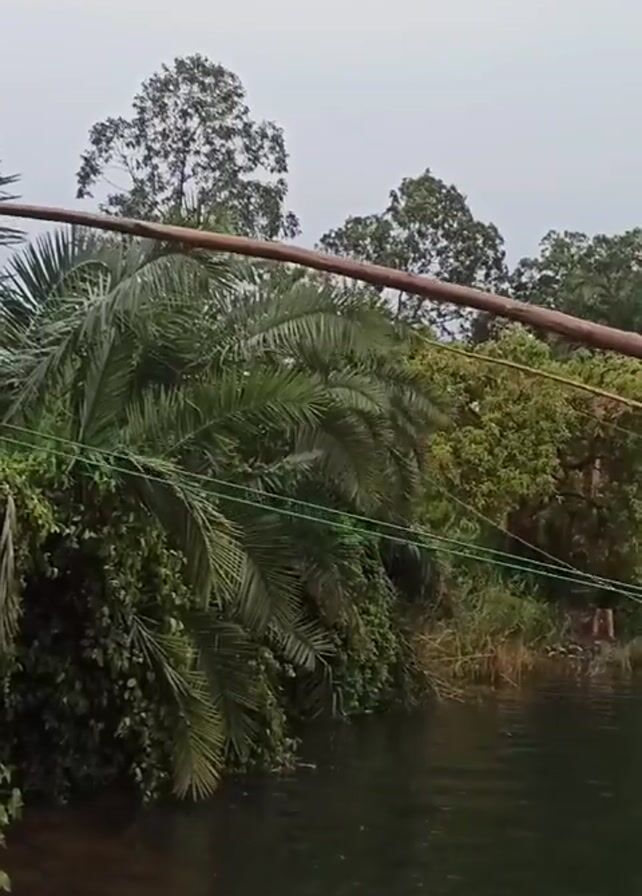The camera pans from a view of a lake surrounded by lush greenery towards a traditional wooden fishing boat in the center of the water. The boat is manned by two individuals who appear to be engaged in operating the vessel. Overhanging the water are wooden poles supported by cables. The sky is overcast.