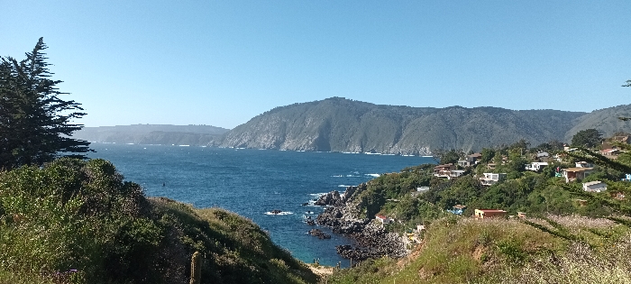 A wide-angle, elevated view of a coastal landscape is depicted under a clear blue sky, situated in the city of Casablanca, Chile. The immediate foreground features a grassy, uneven slope with patches of green shrubs and sparse light-colored flowering vegetation. A tall, dark evergreen tree is partially visible on the far left. The midground presents a deep blue ocean with subtle whitecaps, meeting a rugged coastline composed of dark, jagged rocks and small coves of lighter blue water. Along the right side of the coast, numerous single-story residential buildings in varying colors (white, beige, light blue, reddish-brown) are nestled among dense green foliage on a steep hillside. In the background, a large, dark green, forested mountain range rises sharply from the ocean, with additional hazy mountain forms visible in the far distance. No individuals or specific actions are discernible within the scene.