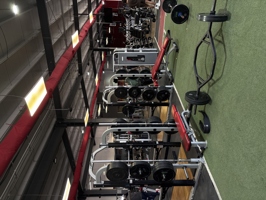 The image displays an indoor gym setting. Rows of squat racks with weight plates line the floor near a weight bench. A hex bar loaded with weights is visible on the right, situated on a green turf area. Overhead, a red duct system runs along the ceiling structure, parallel to the gym equipment. Light fixtures are interspersed along the ductwork. Some people are seen in the distance using the equipment.