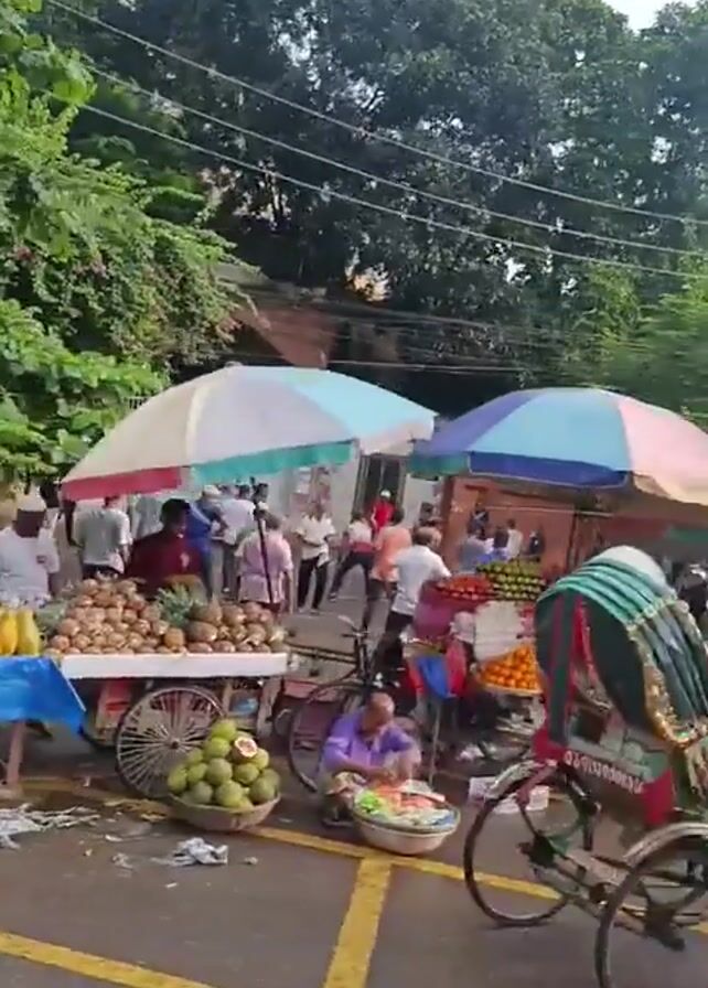 bustling outdoor market, likely in a South Asian country. Various vendors are selling fruits and vegetables from carts and stalls shaded by colorful umbrellas. People are walking around, examining the merchandise, and making purchases. In the foreground, a person is preparing produce in a bowl. Notably, several decorated rickshaws pass through the area, transporting passengers, adding to the vibrant atmosphere of the market. The background features green trees and a building entrance with signage. The pavement is marked with yellow lines.