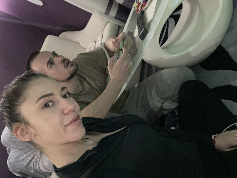 The image depicts two individuals within an indoor residential environment. In the foreground, a female with dark hair pulled back faces the camera, wearing a dark, zippered top. A red-and-white bracelet is visible on her left wrist. Behind her and to the right, a male is seated, his head turned to his right, looking off-camera with a focused expression. He wears a light brown t-shirt and grey sweatpants, holding a light green smartphone with both hands. A white, modern coffee table with a clear glass top is positioned in the midground, displaying a black remote control, a small white dish with colorful patterns, and a piece of white paper. The background shows a purple wall and a light-colored upholstered armchair. The floor is covered by a dark rug featuring lighter abstract patterns. The specific location within Sofia, Bulgaria, cannot be determined from the visual information provided.