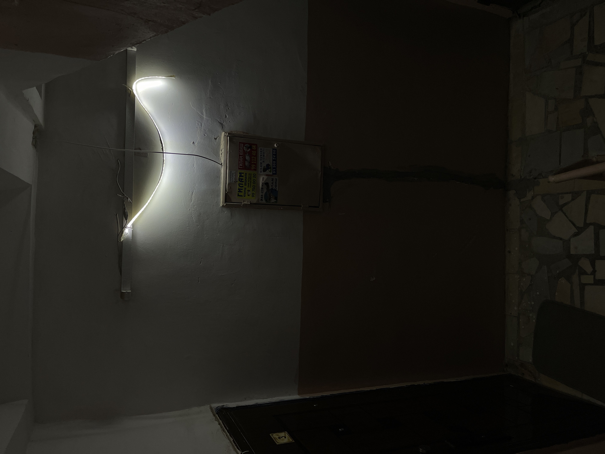 The image captures an interior corner with stark contrasts in lighting. On the left, a bright, curving LED light fixture illuminates a wall with a utility box covered in promotional stickers. The box bears text in Uzbek, advertising "GILAM" or carpet cleaning services with phone numbers. The left side of the wall is painted in a light color, while the right side is a dark, muted brown. Below, a dark doorway or opening is visible. To the far right, a mosaic-tiled wall recedes into the darkness. The location is likely a utility area or stairwell in Navoiy City, Uzbekistan, based on the Uzbek text and the utilitarian nature of the scene.