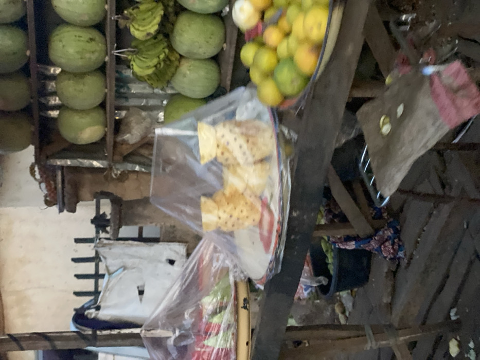 A fruit stand displays several types of produce. Green melons line the top shelf with bunches of green bananas nearby. A bowl overflowing with yellow citrus fruits sits to the side. Below, slices of pineapple are packaged in clear plastic. A patchwork cloth rests on a makeshift shelf, and a black bucket sits on the ground. The stand appears to be constructed of rough, dark wood.