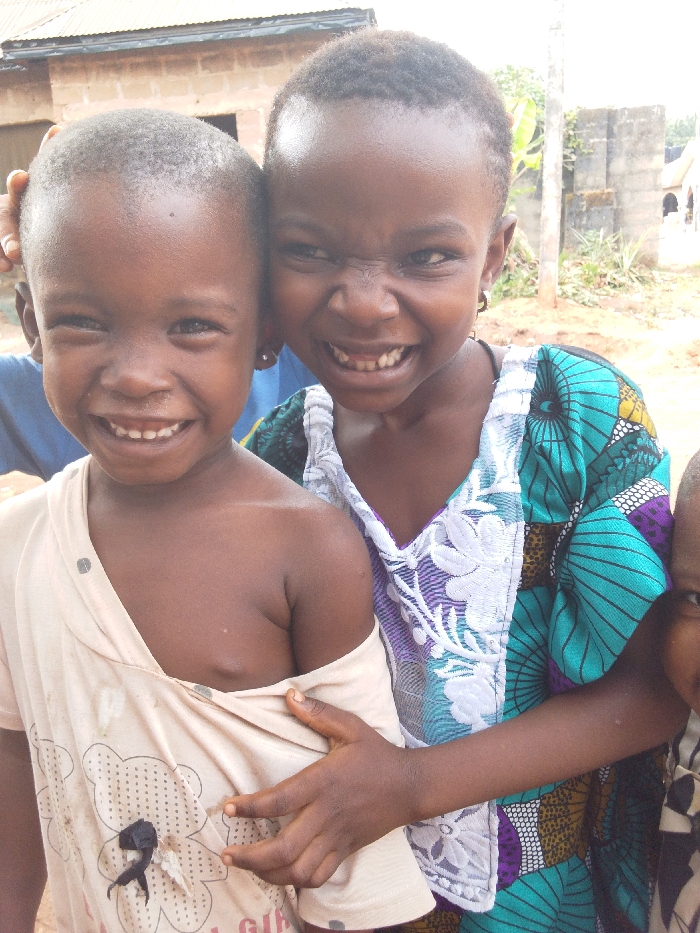 Two young children with dark skin are smiling at the camera
