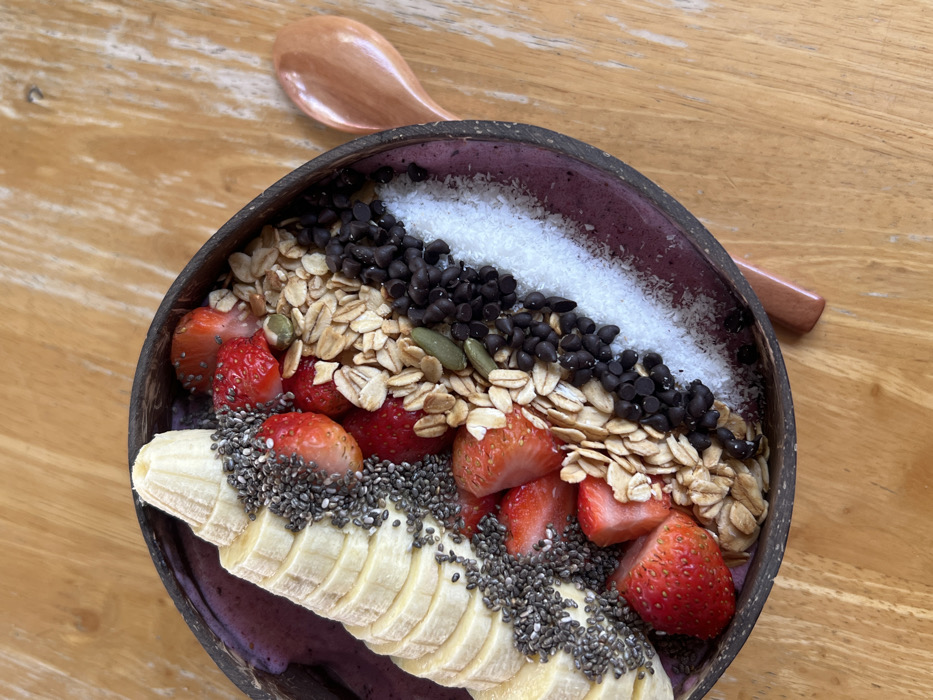 - "A smoothie bowl, served in a dark, textured coconut shell, rests on a light brown wooden table with visible grain" by FM-U93nI3, licensed under CC BY 4.0