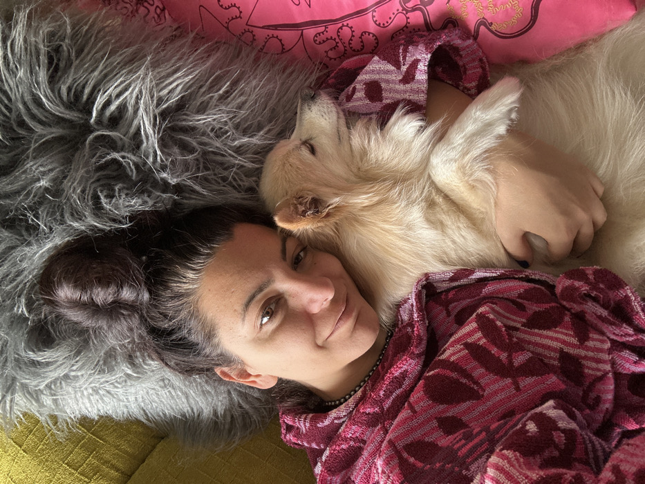 - "An overhead view captures an adult female and a small, light-furred dog reclining indoors" by FM-buMsF3, licensed under CC BY 4.0