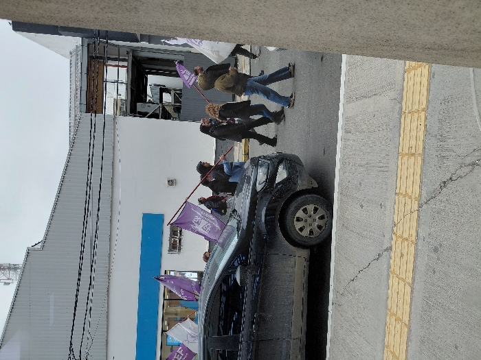 The image captures a street scene in Ushuaia, Argentina, under an overcast sky. In the immediate foreground, a concrete sidewalk displays a yellow tactile paving strip and several cracks. A dark-colored Ford EcoSport SUV, heavily soiled with dirt on its lower half, is parked on the street's left side, facing towards the left frame edge. To the right of the vehicle, a procession of approximately eight to ten individuals walks across the asphalt street from left to right. Most pedestrians are dressed in dark, casual, and warm attire, including jackets and hoodies. They are carrying multiple flags on poles; the majority are solid purple, some bearing the white text "S.E.P." and a stylized logo, while one white flag with similar purple markings is also visible. In the background, a large white building with a corrugated metal roof and a horizontal blue stripe at its base is prominent. Multiple black utility lines are strung horizontally across the upper portion of this building, and a communications tower is visible above its roofline. To the right, another structure features exposed metal framework, suggesting either construction or a state of disrepair. A plain grey wall forms the far right background.