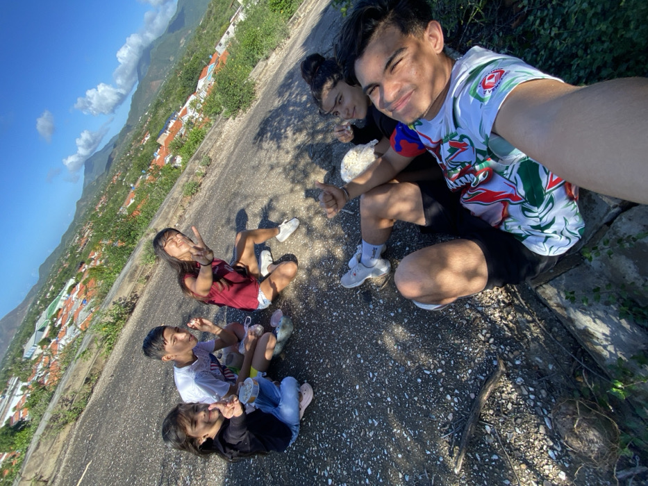 Five people are sitting on an angled asphalt surface with a mountain view in the background. A young man in a patterned shirt takes a selfie, smiling towards the camera, while a woman beside him looks at the camera, holding what appears to be popcorn. Below them, a woman in a maroon shirt makes a peace sign. Further down, two children sit side-by-side, with one smiling and the other looking upward. The area is sunlit, and shadows fall across the surface.