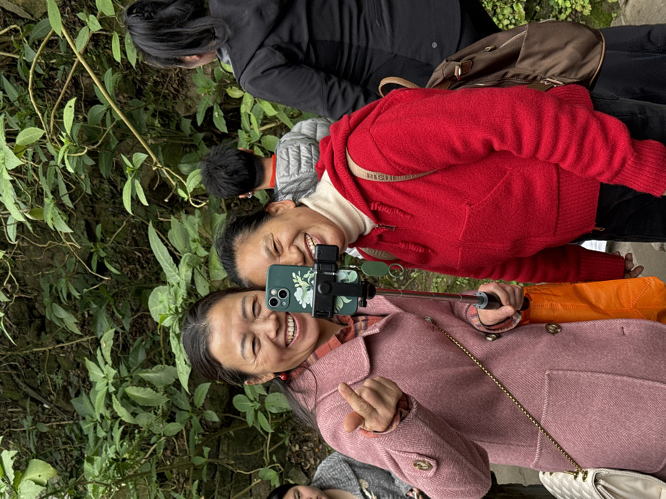 The scene is an outdoor setting, likely a natural park or green space within Beibei, China. In the foreground, two East Asian women are observed posing for a photograph. The woman on the left, with dark hair and a red earring, wears a pink wool coat over a plaid shirt and carries a white quilted shoulder bag. She holds a silver selfie stick, to which a dark green iPhone with a white floral-patterned case is mounted, angled to capture both women. Her left hand is raised, with the index finger extended towards the camera. The woman on the right, with dark hair pulled back, wears a red hooded sweater over a cream turtleneck and a brown backpack. Both women are smiling broadly and looking towards the phone's camera. The background consists of dense green foliage covering a sloped area. Partially visible individuals include one person in a grey garment on the far left, another person with short dark hair wearing a grey puffer jacket behind the primary subjects, and a third person in a black hooded jacket on the far right, all facing away or partially obscured.