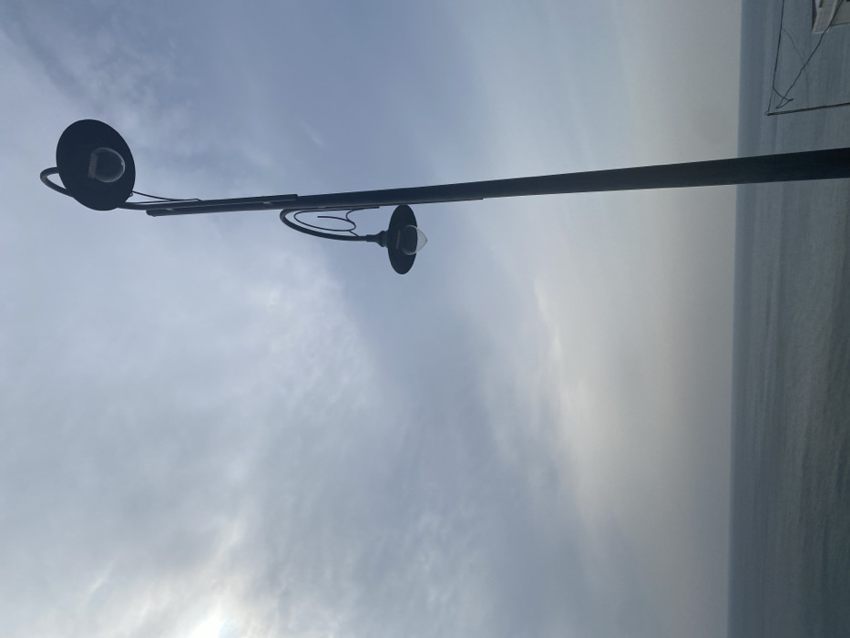 The image depicts an outdoor coastal scene under an overcast sky. A tall, dark-colored streetlamp with two distinct light fixtures occupies the right side of the frame, extending from the bottom edge to the top. The upper light fixture consists of a broad, dark, disc-shaped shade with a clear, downward-pointing, spherical or teardrop-shaped bulb. The lower light fixture is positioned beneath it, attached to the main pole by a decorative, curved, dark metal arm, mirroring the design of the upper fixture with a similar shade and clear, downward-pointing bulb. In the background, a vast body of water, identified as the Black Sea, stretches horizontally across the lower and middle sections of the image, displaying a calm, rippled surface. Above the sea, the sky is predominantly cloudy, with varying shades of grey and white, indicating an overcast condition. A diffuse area of brighter light, likely the sun obscured by clouds, is visible in the upper-left quadrant. A small, indistinct portion of a white structure or railing is partially visible in the bottom right corner, below and to the right of the streetlamp. No individuals or active subjects are present. The scene is consistent with a viewpoint or promenade along the coast of Anapa, Russia.