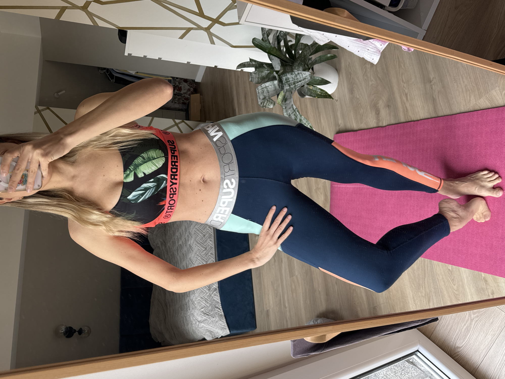 A blonde woman in workout clothes stands on a pink yoga mat in front of a mirror. She wears a palm print sports bra and navy leggings with a light green waistband and orange trim. She holds a phone to take a photo of herself in the mirror. The room is tidy with light-colored wood floors. There is a bed with blue cushions and a white and gray comforter in the background. A white dresser with a plant on top is also visible. The location appears to be indoors, possibly a bedroom or living area. The location within the city of Carnikava, Latvia cannot be ascertained.