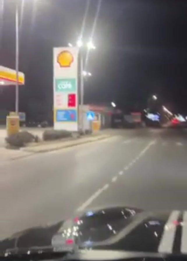 view from the inside of a car driving past a Shell gas station at night. The car appears to have white stripes on the hood. The gas station is brightly lit, and a few cars are visible at the pumps and parked nearby. The road is paved and has lane markings. Streetlights illuminate the road and surrounding area. The overall environment suggests a commercial area on the outskirts of a town or city.