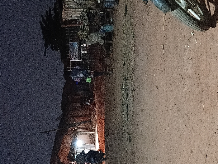 An angled shot captures a dimly lit scene. On the left, a dark sky looms over a building with a lighted doorway and fence adorned with hanging items. A dark object resembling a tree stands nearby. The right side features a dirt or gravel road, with a partial view of a motorcycle tire in the upper corner. The overall atmosphere is grainy and dark, suggesting a nighttime setting.