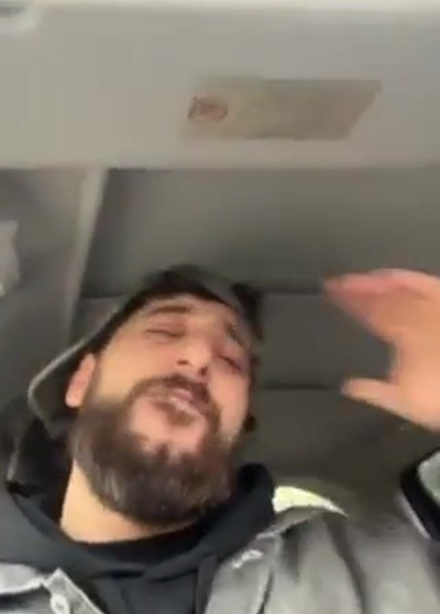 A man in a gray baseball cap, black hoodie, and gray jacket is in a car, looking into the camera and laughing. He is wearing a seatbelt. The car ceiling is gray. The man puts his hand to his forehead and laughs hysterically, sticking out his tongue. He is bearded. He sings and smiles into the camera.
