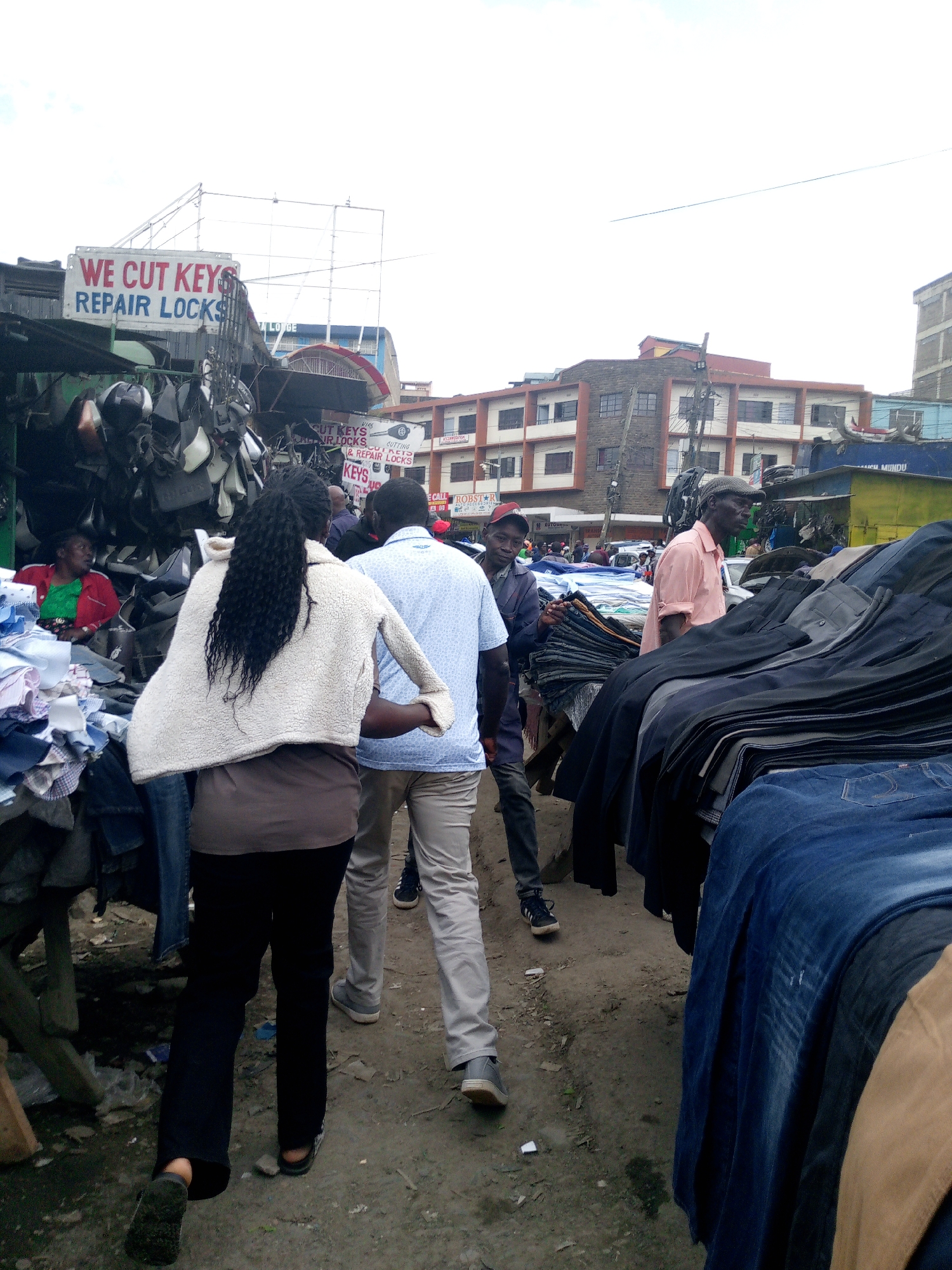 The image depicts a bustling street market scene in Nairobi, Kenya, characterized by vendors selling clothes. A woman with long, black hair wearing a cream-colored jacket and black pants walks through the market alongside a man in a light blue patterned shirt and khaki pants. Another man with a red cap is visible behind them. To the right, stacks of folded pants and jeans are neatly piled on a makeshift table. In the background, an older man in a pink shirt and a cap stands near the clothing, while another man in a navy jacket and a red cap are visible, adding to the sense of activity. The backdrop reveals buildings with a reddish-brown color scheme. Signs indicating services like "WE CUT KEYS REPAIR LOCKS" are posted above the market stalls. The ground is unpaved and somewhat uneven.
