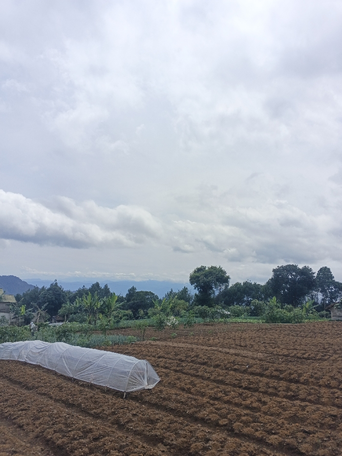 The image displays an agricultural landscape under an overcast sky in Kampong Chhnang, Cambodia. The foreground is dominated by a field of tilled, dark brown soil, arranged in discernible furrows running horizontally across the frame. A white, semi-transparent, tunnel-shaped structure, approximately 6-8 meters long and consistent with a low greenhouse or crop cover, is positioned on the left side of the field. Beyond the tilled area, a band of mixed green vegetation, including smaller crops and plants, extends horizontally. Further back, a dense line of mature green trees forms the immediate horizon, behind which a range of faint, blue-hued mountains is visible. The sky occupies approximately two-thirds of the upper frame, filled with dense, uniform grey and white clouds. Partially visible structures, appearing to be small buildings or sheds, are present on the far left and far right edges of the midground, partially obscured by vegetation. No individuals, specific actions, or interactions are discernible within the scene.