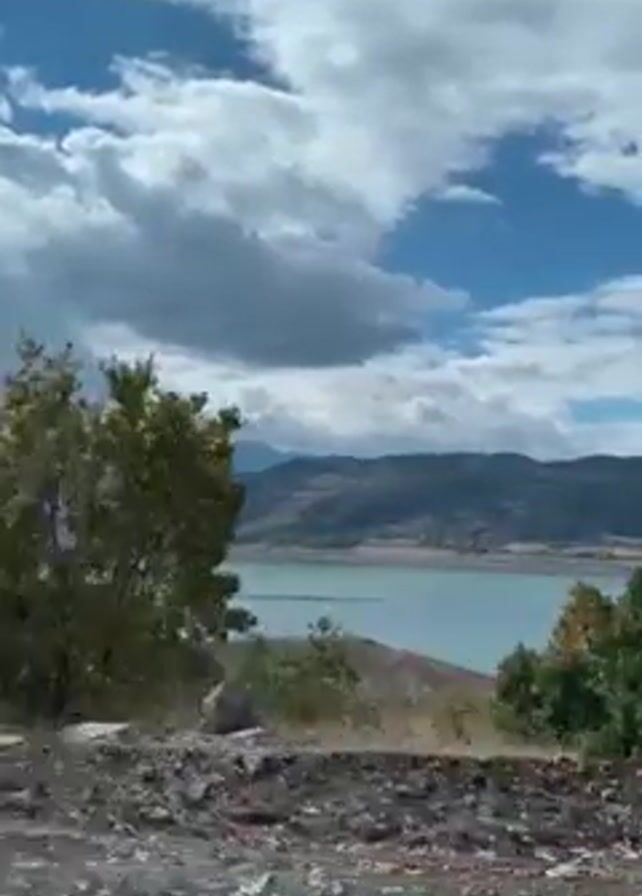 scenic view of a lake surrounded by mountains under a cloudy blue sky. The camera moves, seemingly from a vehicle, revealing vegetation in the foreground and a yellow road sign at one point. There are no people visible in the frame.