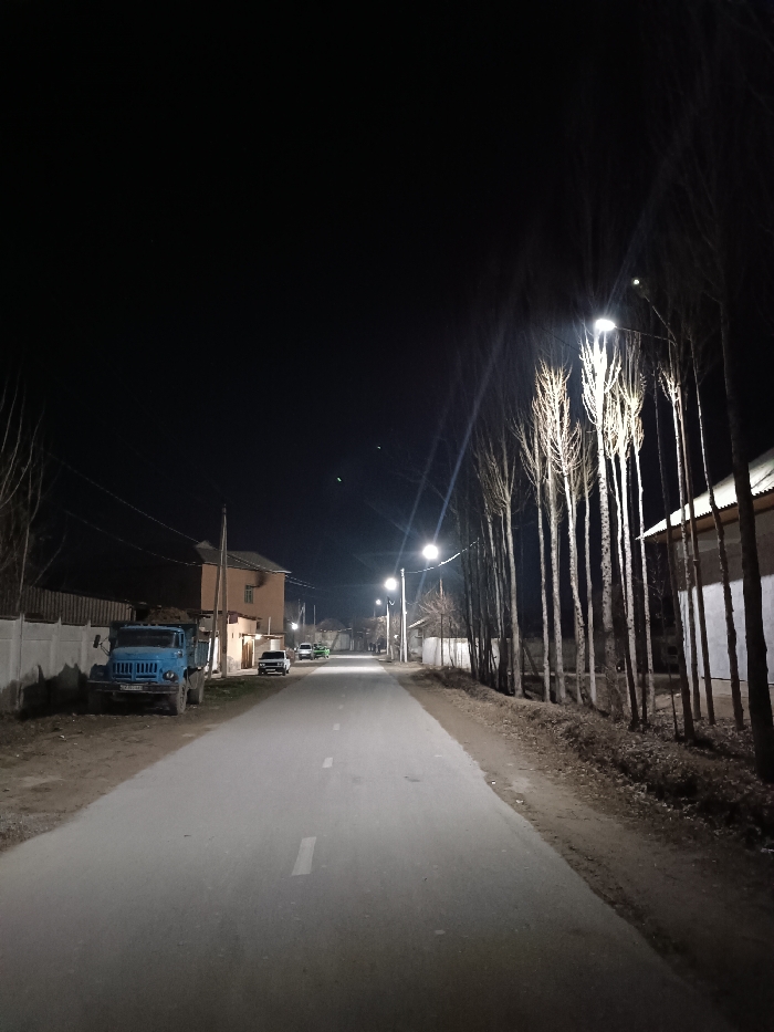 A nighttime street scene features a long road illuminated by evenly spaced streetlights. A blue truck is parked on the left side of the road, near a fence and a building. On the right, tall, thin trees line the edge of the road next to a house with a white wall. Several cars are parked farther down the street, adding to the quiet, residential atmosphere.