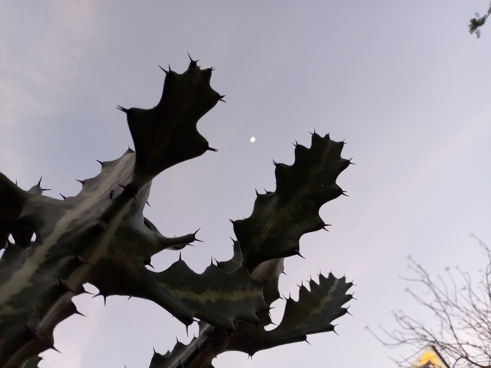 This image captures a low-angle perspective of a thorny, multi-stemmed succulent plant, likely a euphorbia or cactus, set against a light grey and subtle lavender-hued sky in the city of El Dátil, Venezuela. The plant's dark green, ribbed stems, adorned with prominent sharp thorns, dominate the left and central-lower portions of the frame, appearing largely silhouetted. A small, distinct white circular object, identified as the moon, is visible in the upper-middle sky between two of the plant's branches. Out-of-focus bare tree branches are partially visible in the lower right background. No people or direct actions are depicted.