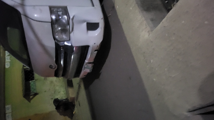 A white van is positioned near a gray concrete barrier, likely a curb or wall. The van has sustained damage to its front end, notably on the left side, where there's a visible dent. The area is shadowy, hinting at low-light conditions. A building with greenery and what appears to be a window is partially visible in the background.