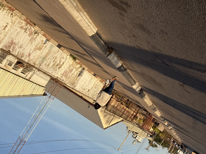 The image depicts a street scene in Barakin Lerawi, Nigeria, under clear skies with strong, directional daylight creating long shadows, indicative of either early morning or late afternoon. A single individual is seen from behind, walking away from the camera on a concrete sidewalk located on the right side of the frame. This person wears a light-colored, possibly patterned top, dark blue jeans, and orange sandals, and carries a white bag in their right hand. The sidewalk is bordered by a curb painted in alternating white and dark grey/black sections, with some reddish-brown markings at its base. Adjacent to the sidewalk on the right is a long, cream-colored wall exhibiting significant peeling paint and discoloration in patches of red, grey, and green. Behind this wall, industrial-style buildings with corrugated metal roofs, one light grey and another yellowish, are visible. Windows on these buildings appear rusted and are protected by razor wire. A tall, metallic lattice telecommunications tower stands prominently in the background on the right. The asphalt road, showing signs of wear, stretches into the distance, with utility poles and overhead wires lining its left side. Other vehicles are faintly discernible further down the road on the left. The environment suggests an urban or industrial area with aged infrastructure.
