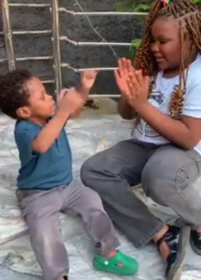 Two children are sitting on a stone tile surface next to a metal railing. The younger child is a boy, dressed in a short-sleeved, blue button-up shirt, grey pants, and green shoes. He has dark curly hair. The other child is a girl, with long, curly, braided hair with a few blue hair ties. She is wearing a white t-shirt with a graphic, grey jeans, and black shoes. They are clapping their hands together in a playful manner, looking at each other and smiling. The background includes a wall with some greenery visible.