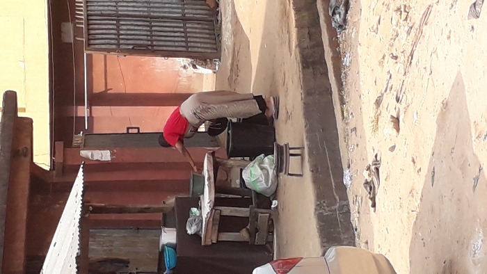 The image depicts an outdoor scene in Onitsha, Nigeria, characterized by a mix of worn architecture and everyday activity under bright daylight. In the foreground, the rear section of a light-colored vehicle, possibly silver or beige, is partially visible on the far left. The ground consists of uneven, light-brown dirt and sand, with scattered debris including small rocks and crumpled material. A concrete curb separates the dirt path from a slightly elevated concrete surface where the primary activity occurs. One individual, viewed from the back and slightly to the left, is the central human subject. They wear a red t-shirt, a long light-tan or beige skirt/wrapper over dark trousers or a dark skirt, and light-colored flip-flops. The person is bent forward, reaching with their right hand into or towards a black cylindrical bucket positioned on the concrete surface. To the left of the individual, a rustic wooden table serves as a makeshift counter. On its surface are a white plastic bag, a green bowl, a white pot, and a light blue bowl. Beneath the table, a green plastic bag rests on the ground, along with what appear to be wooden supports or crates. Immediately in front of the black bucket and the individual, a small, dark, three-legged stand or stool sits on the concrete. The background features a structure with faded red-orange walls. On the left side of this structure, a corrugated metal canopy extends outwards. A dark, possibly wooden, door with a vertical handle is visible within the red-orange wall. Further to the right, a large, vertically-ribbed corrugated metal gate, appearing partially ajar, is integrated into the wall. Above the red-orange structure, a portion of a lighter yellow building is visible under a clear sky. The overall impression is that of a bustling, utilitarian urban environment.