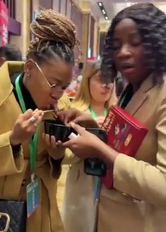 Two Black women in tan jackets are eating noodles at an indoor venue. The woman on the left has her hair in a high bun of braids and is using chopsticks to eat noodles from a small black bowl. She is wearing a black turtleneck and a green lanyard, and she has a black purse slung over her shoulder. The woman on the right is looking at the noodles with a skeptical expression as the other woman eats. She is holding a red box in her hand. A blonde woman in a green shirt is standing behind them and slightly to the right. There are other people in the background and signage indicating that this is likely a trade show.