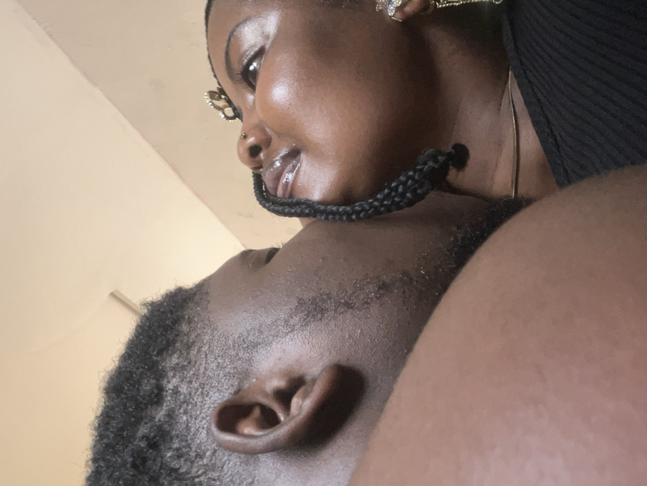 An intimate, close-up shot of two dark-skinned individuals. The top person is looking down with a slight smile, showcasing shiny lips, a nose piercing, and decorative earrings. A braided strand rests across their face and the other person's neck. The person below is lying down, facing upwards. Details like the ear and hair texture are visible. The image has a warm tone and appears to be taken at a close range.