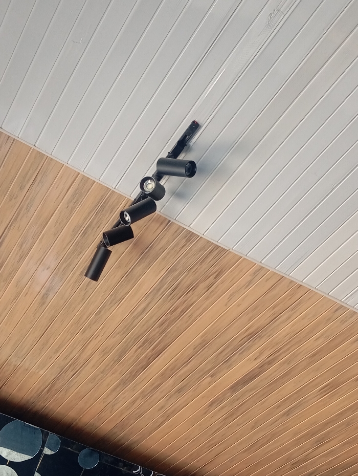 The image displays an interior ceiling in Gura Top, Nigeria, divided diagonally from the upper left to the lower right into two distinct sections. The upper section consists of white horizontal paneled material, while the lower section features brown horizontal wood-grain paneled material. A black track lighting system is affixed to the ceiling, extending across both paneled sections. This system supports five black cylindrical spotlights, three of which show active illumination. A dark, partially visible object with circular silver patterns is present at the bottom left edge of the frame. No individuals or actions are depicted.