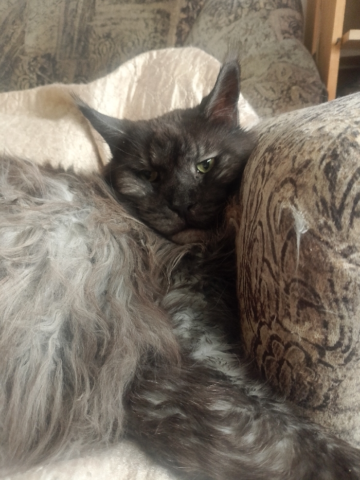 - "A long-haired, dark gray to black cat with prominent ear tufts and partially open green eyes is depicted resting on upholstered furniture" by FM-mibk92, licensed under CC BY 4.0