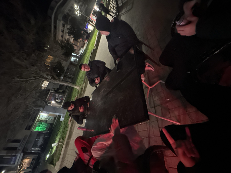 An outdoor nighttime scene in Petrich, Bulgaria, depicts a group of at least six individuals gathered around a rectangular black table with light-colored metal legs