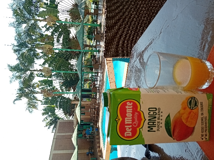 - "A Del Monte Quality Mango Juice Blend 1-litre carton and a partially filled glass of orange juice rest on an orange placemat atop a dark, possibly woven or stone tabletop in the foreground" by FM-FCCQg2, licensed under CC BY 4.0